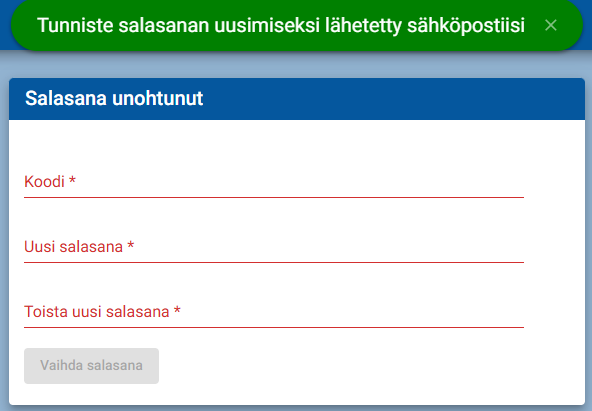 Syötä sähköpostista löytyvä koodi sille varattuun kenttään ja valitse uusi salasana ja toista se. Sen jälkeen klikkaa vaihda salasana.